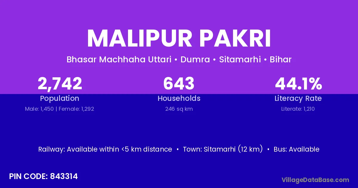 Sitamarhi (12 km) is the nearest town to Malipur Pakri village for major economic activities and is located approximately 12 km away.