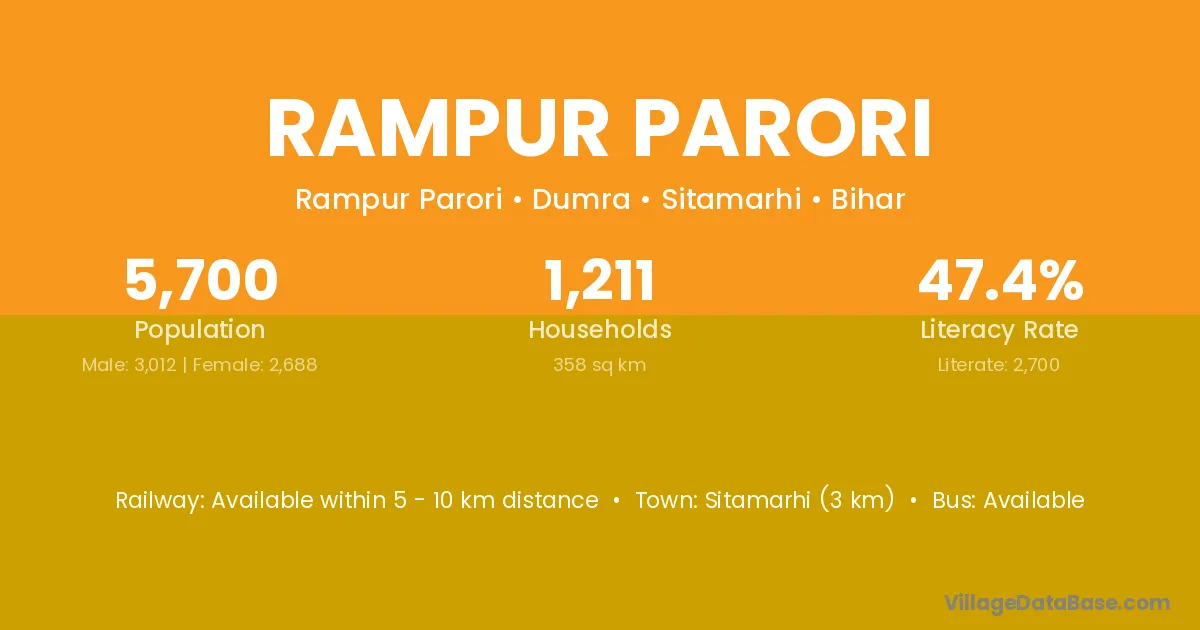Sitamarhi (3 km) is the nearest town to Rampur Parori village for major economic activities and is located approximately 3 km away.