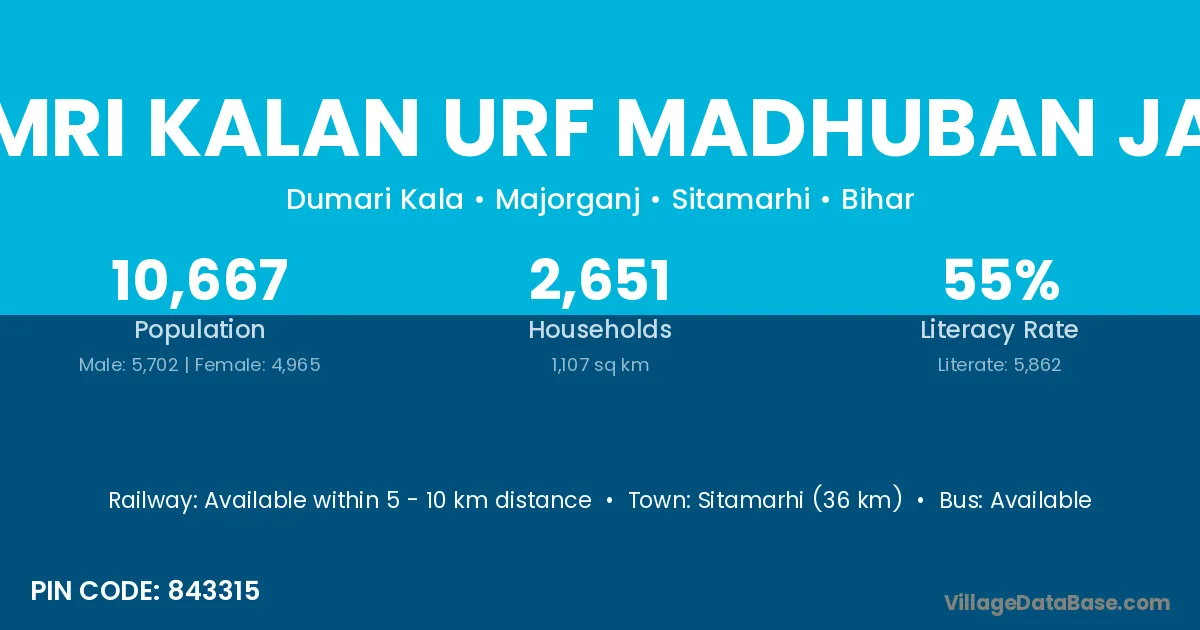 Sitamarhi (36 km) is the nearest town to Dumri Kalan Urf Madhuban Jadu village for major economic activities and is located approximately 36 km away.