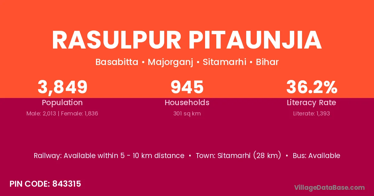 Sitamarhi (28 km) is the nearest town to Rasulpur Pitaunjia village for major economic activities and is located approximately 28 km away.