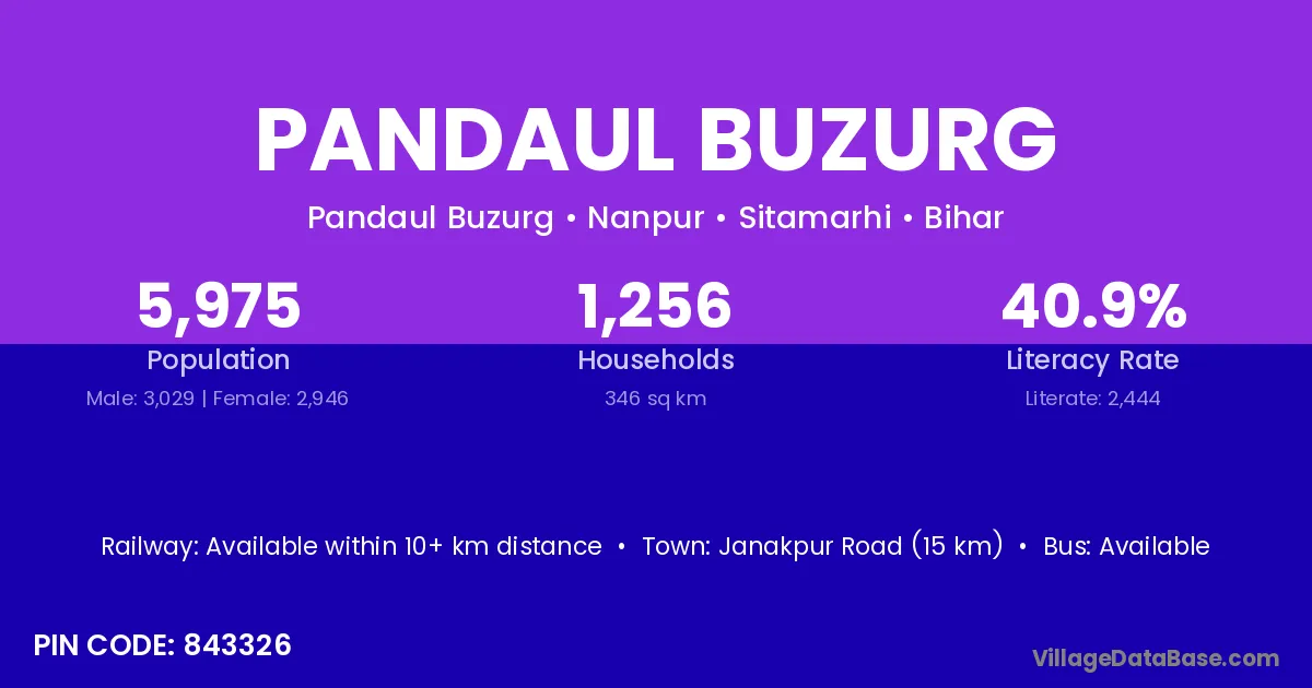 Janakpur Road (15 km) is the nearest town to Pandaul Buzurg village for major economic activities and is located approximately 15 km away.