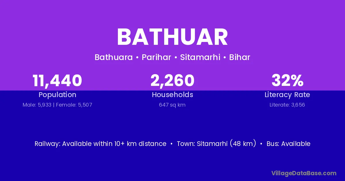 Sitamarhi (48 km) is the nearest town to Bathuar village for major economic activities and is located approximately 48 km away.