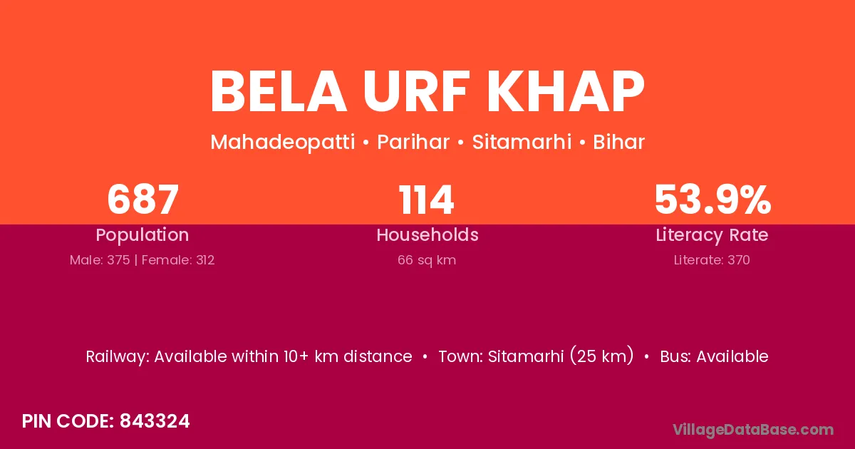 Sitamarhi (25 km) is the nearest town to Bela Urf Khap village for major economic activities and is located approximately 25 km away.