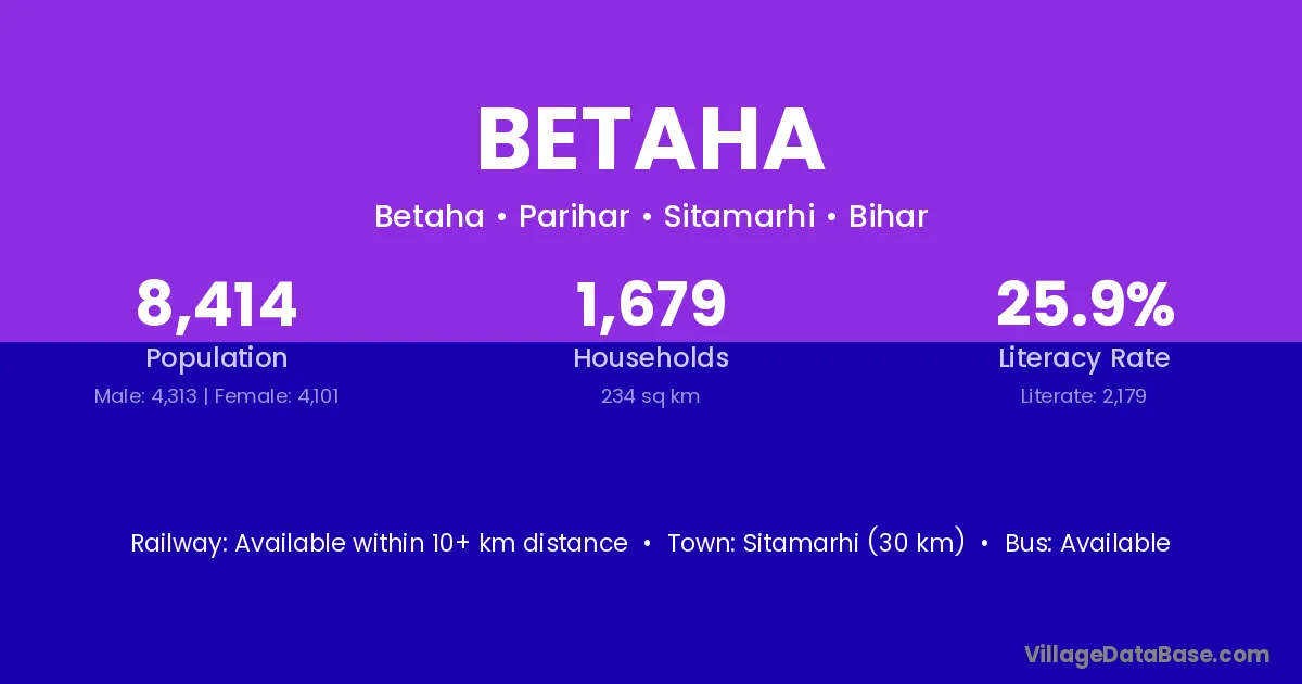 Sitamarhi (30 km) is the nearest town to Betaha village for major economic activities and is located approximately 30 km away.