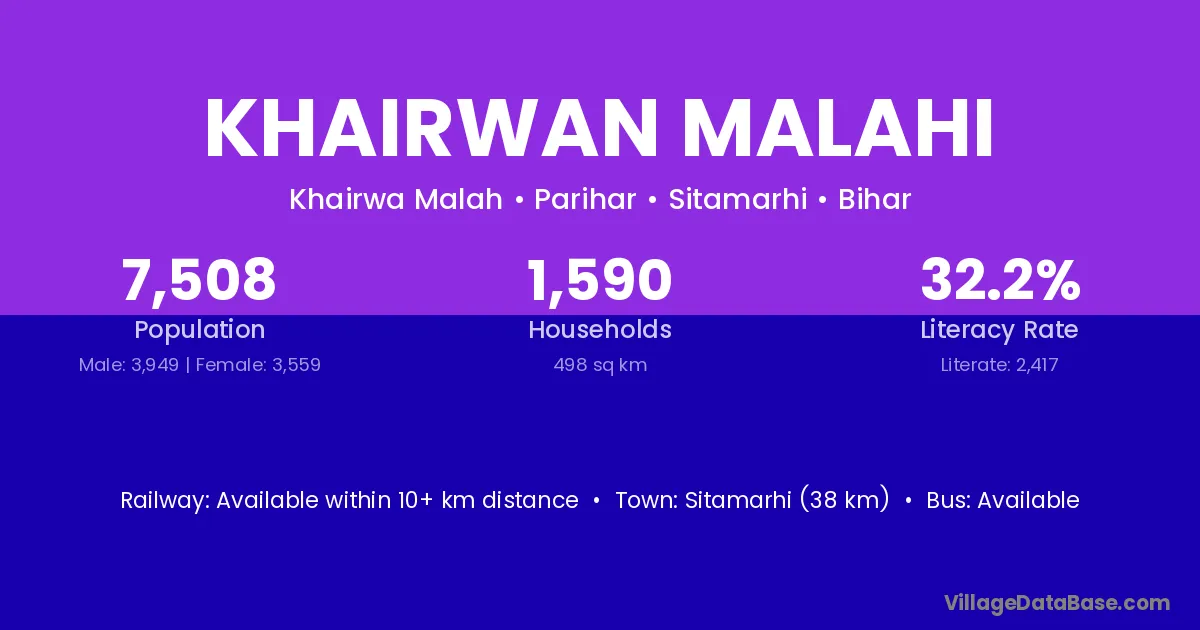 Sitamarhi (38 km) is the nearest town to Khairwan Malahi village for major economic activities and is located approximately 38 km away.