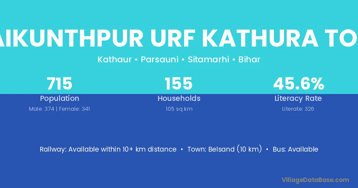 Baikunthpur Urf Kathura Tola village has a total population of 715 people, of which 374 are males and 341 are females.