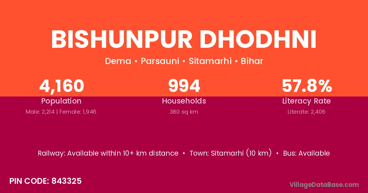 Sitamarhi (10 km) is the nearest town to Bishunpur Dhodhni village for major economic activities and is located approximately 10 km away.