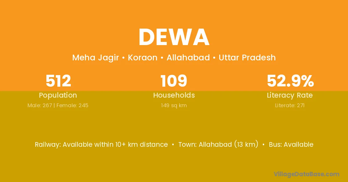 Dewa village has a total population of 5,183 people, of which 2,687 are males and 2,496 are females.