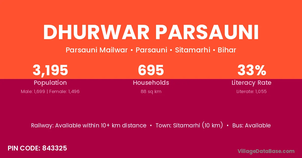 Dhurwar Parsauni village has a total population of 3,195 people, of which 1,699 are males and 1,496 are females.