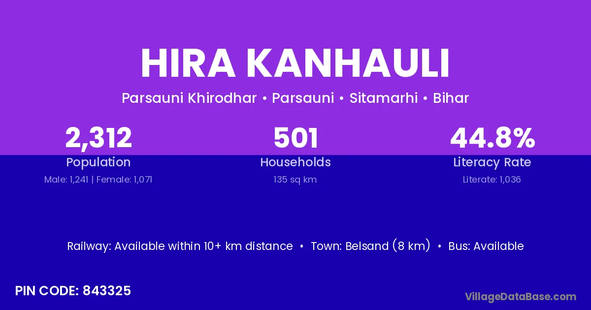 Belsand (8 km) is the nearest town to Hira Kanhauli village for major economic activities and is located approximately 8 km away.