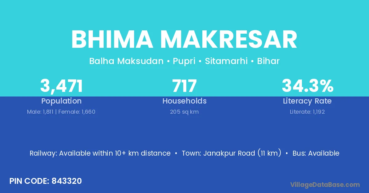 Janakpur Road (11 km) is the nearest town to Bhima Makresar village for major economic activities and is located approximately 11 km away.