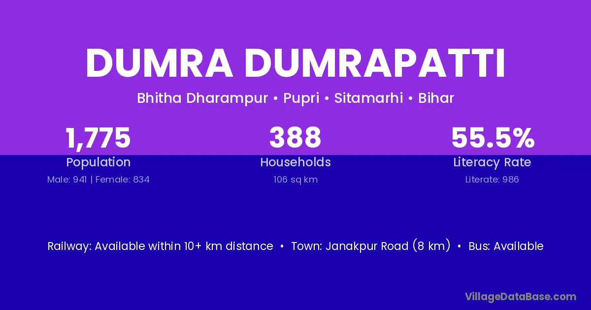 Janakpur Road (8 km) is the nearest town to Dumra Dumrapatti village for major economic activities and is located approximately 8 km away.