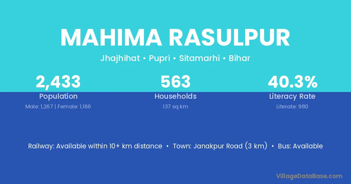 Janakpur Road (3 km) is the nearest town to Mahima Rasulpur village for major economic activities and is located approximately 3 km away.