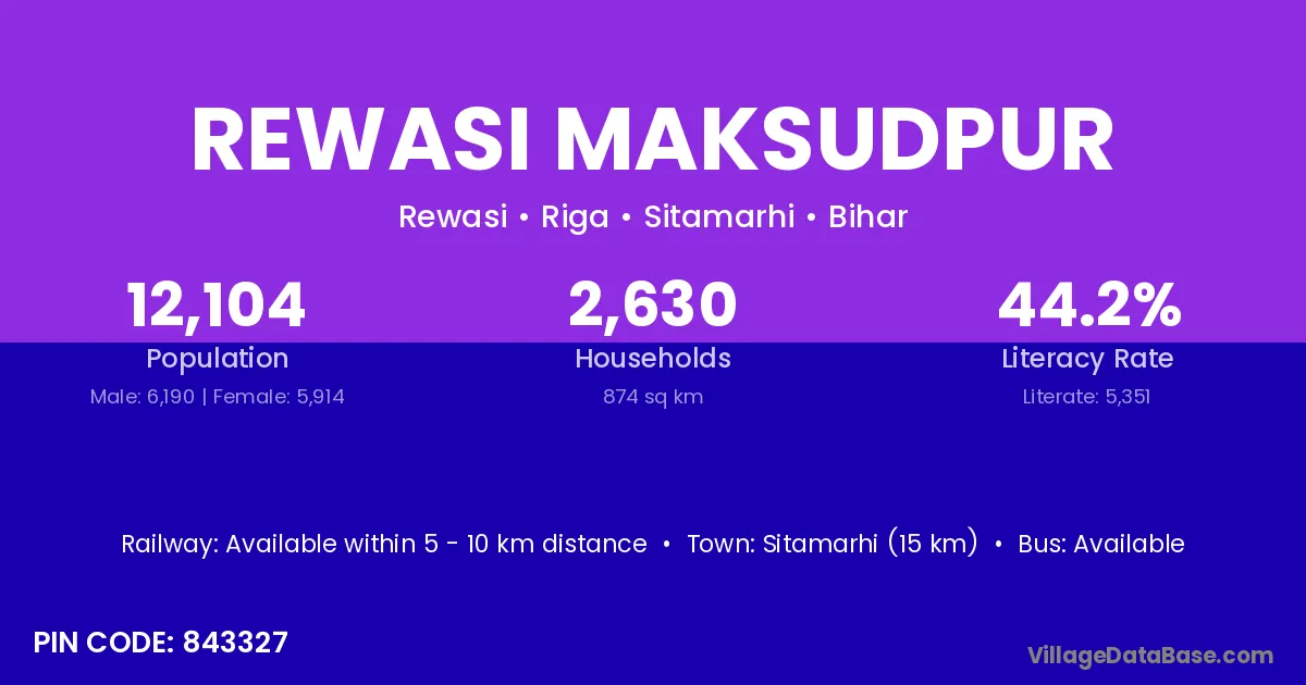 Sitamarhi (15 km) is the nearest town to Rewasi Maksudpur village for major economic activities and is located approximately 15 km away.