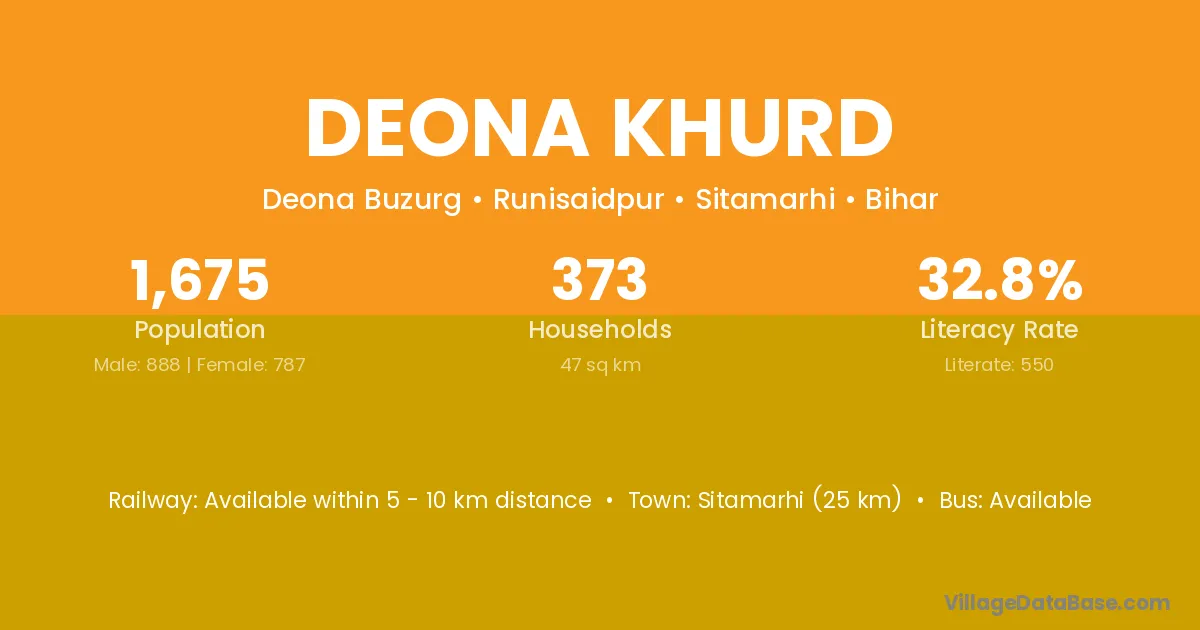 Sitamarhi (25 km) is the nearest town to Deona Khurd village for major economic activities and is located approximately 25 km away.