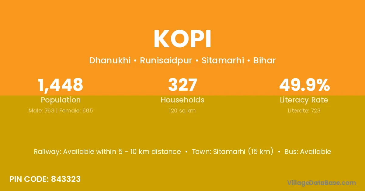 Sitamarhi (15 km) is the nearest town to Kopi village for major economic activities and is located approximately 15 km away.