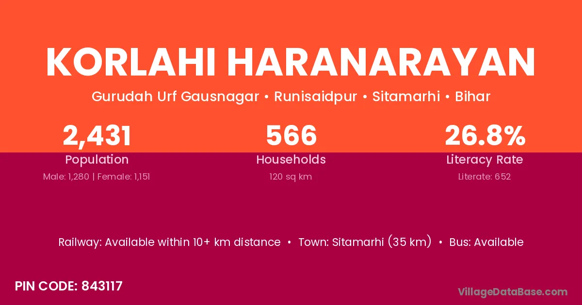 Sitamarhi (35 km) is the nearest town to Korlahi Haranarayan village for major economic activities and is located approximately 35 km away.