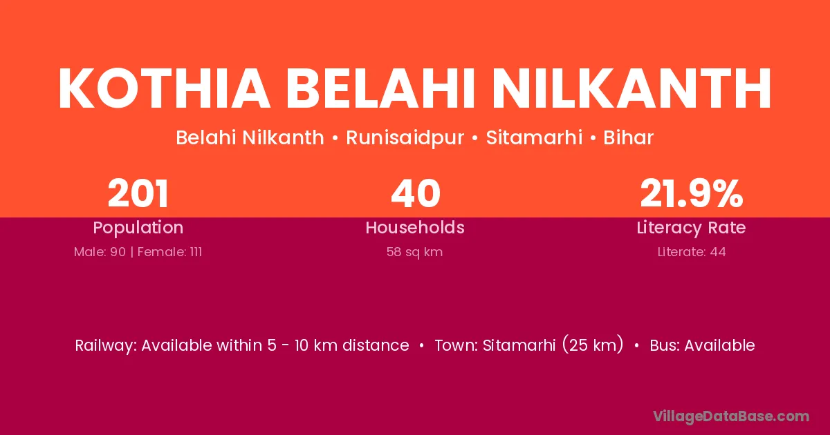 Kothia Belahi Nilkanth village has a total population of 201 people, of which 90 are males and 111 are females.
