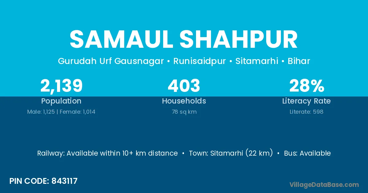 Sitamarhi (22 km) is the nearest town to Samaul Shahpur village for major economic activities and is located approximately 22 km away.