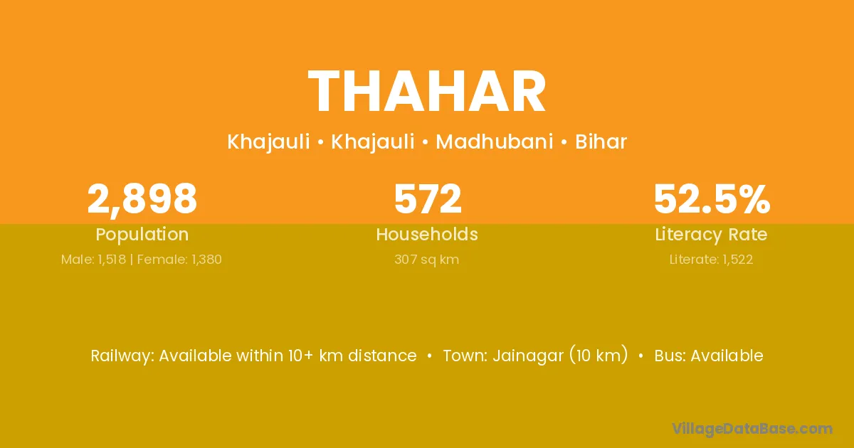 Sitamarhi (25 km) is the nearest town to Thahar village for major economic activities and is located approximately 25 km away.