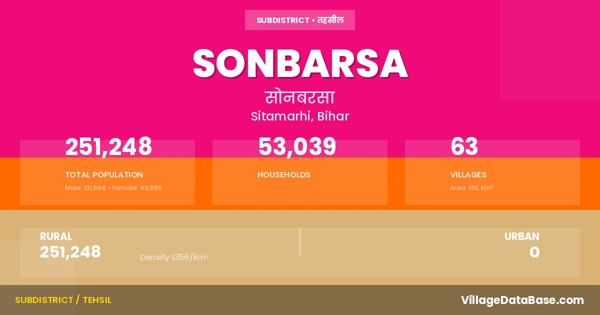 According to the 2011 census The total area of Sonbarsa Subdivision is 185 km², with a population of 251248 people. The population density is 1,356 inhabitants per square kilometre, and there are approximately 53039 houses in the sub district.