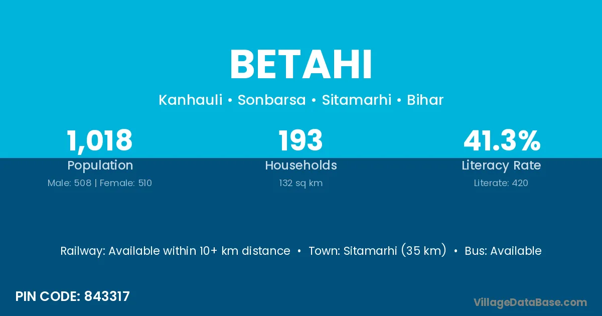 Betahi village has a total population of 1,018 people, of which 508 are males and 510 are females.