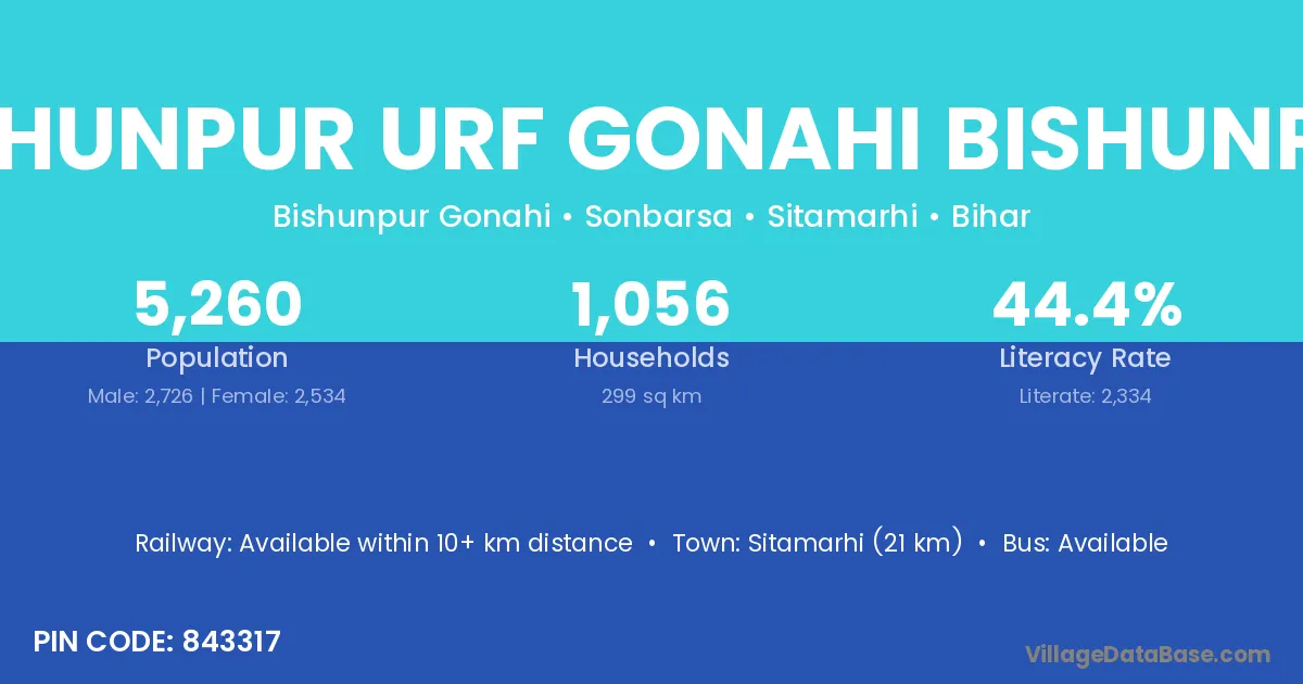 Sitamarhi (21 km) is the nearest town to Bishunpur Urf Gonahi Bishunpur village for major economic activities and is located approximately 21 km away.