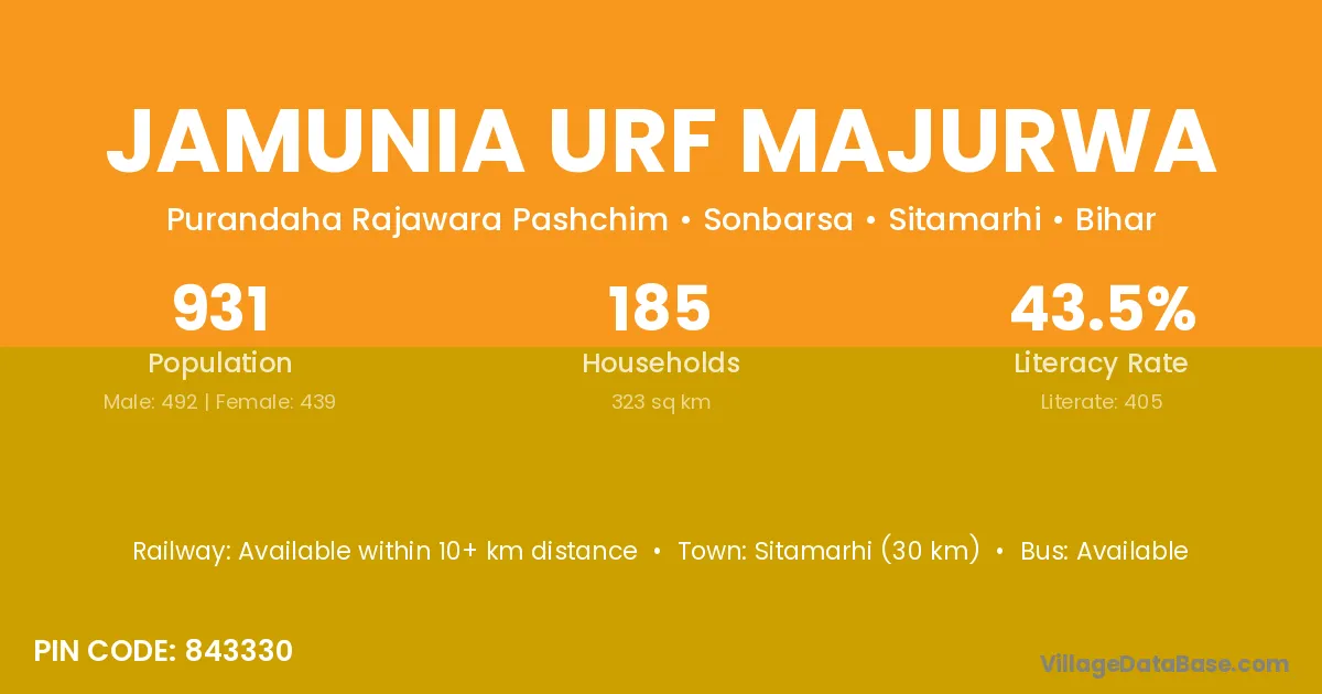Sitamarhi (30 km) is the nearest town to Jamunia Urf Majurwa village for major economic activities and is located approximately 30 km away.