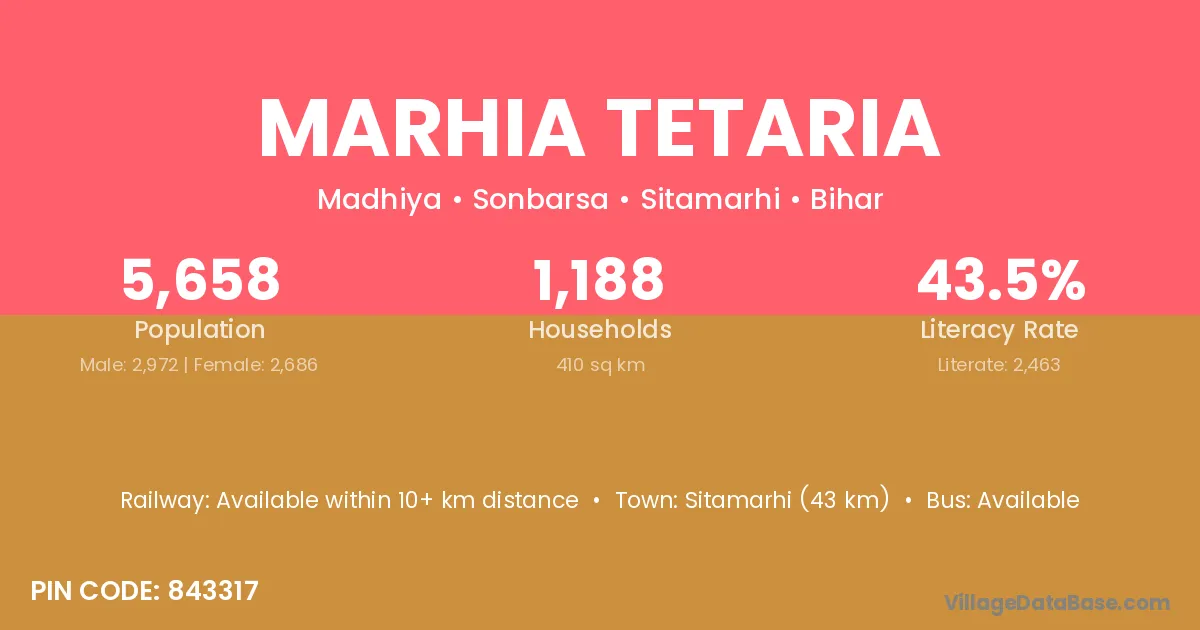 Sitamarhi (43 km) is the nearest town to Marhia Tetaria village for major economic activities and is located approximately 43 km away.