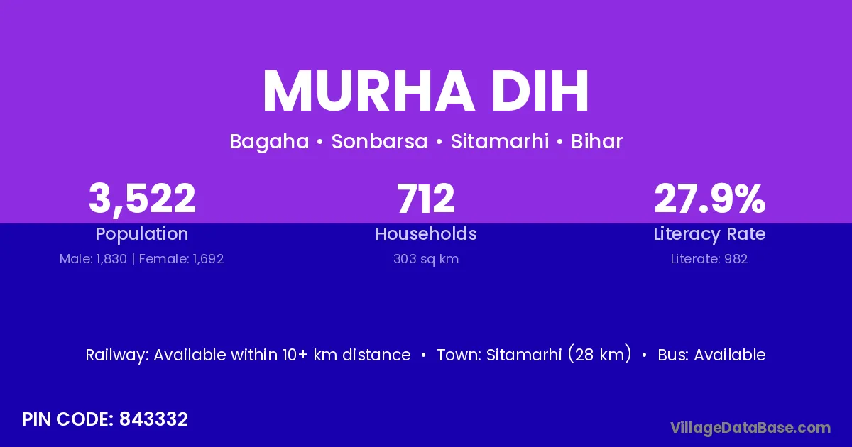 Sitamarhi (28 km) is the nearest town to Murha Dih village for major economic activities and is located approximately 28 km away.