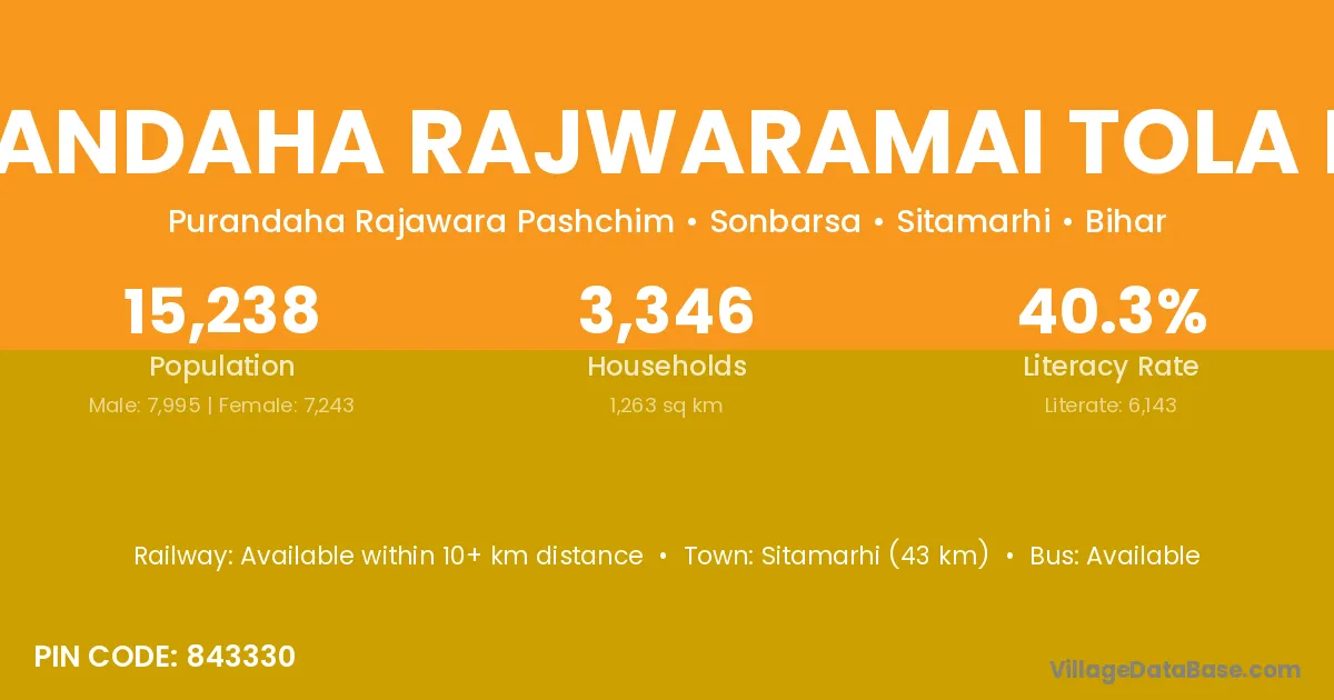 Purandaha Rajwaramai Tola Mus village has a total population of 15,238 people, of which 7,995 are males and 7,243 are females.