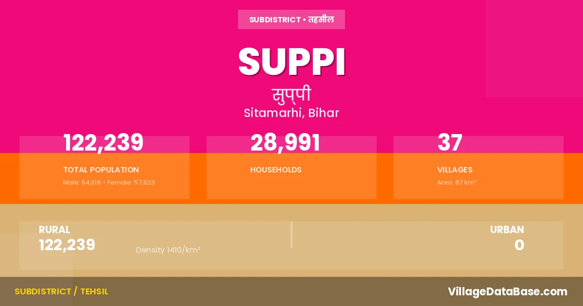 Suppi is a town and Subdivision in the Sitamarhi district of the Bihar. In India, a Subdivision is a subdivision of a district responsible for the administration and revenue collection of a specific area within the district. Subdivisions play a crucial role in the local governance structure, contributing significantly to the development and administration of their communities.