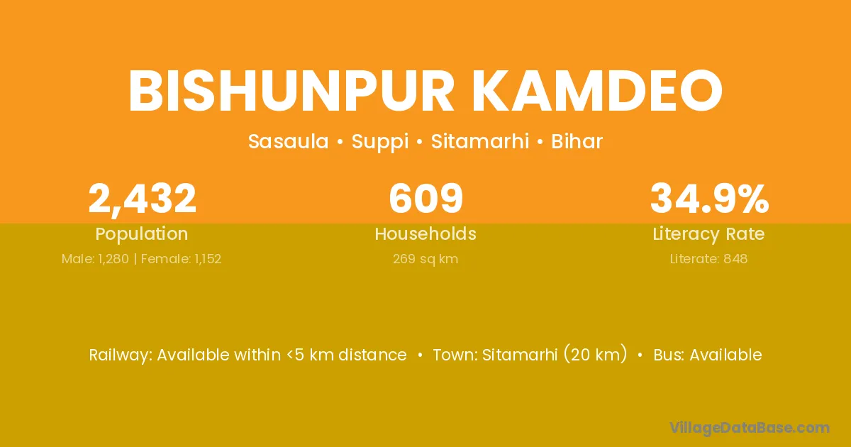 Sitamarhi (20 km) is the nearest town to Bishunpur Kamdeo village for major economic activities and is located approximately 20 km away.