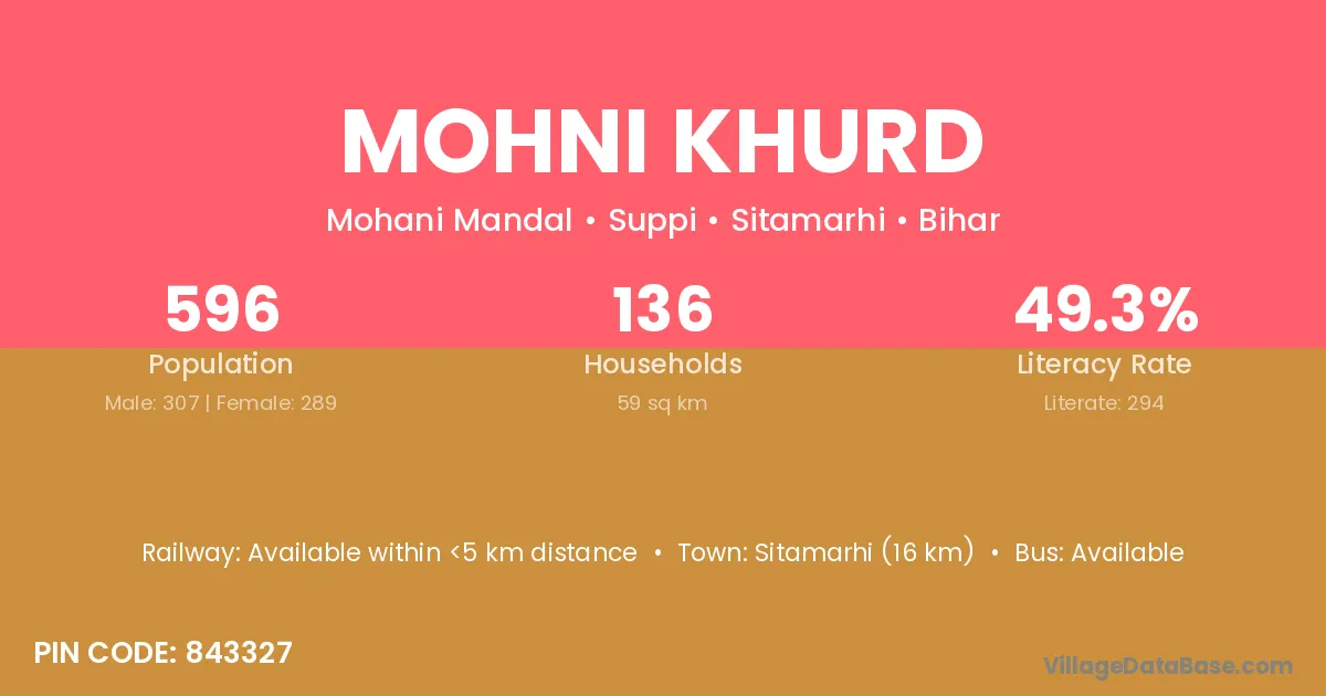 Sitamarhi (16 km) is the nearest town to Mohni Khurd village for major economic activities and is located approximately 16 km away.