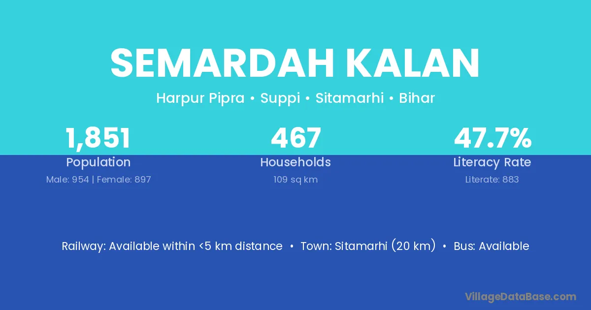 Sitamarhi (20 km) is the nearest town to Semardah Kalan village for major economic activities and is located approximately 20 km away.