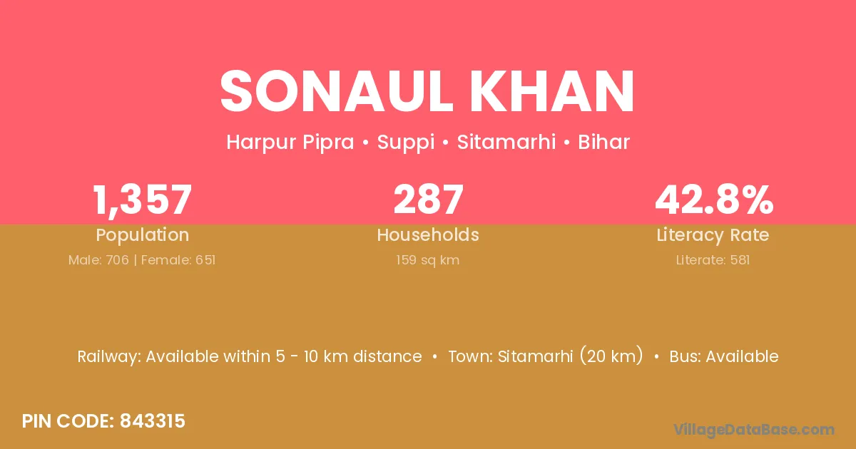 Sitamarhi (20 km) is the nearest town to Sonaul Khan village for major economic activities and is located approximately 20 km away.