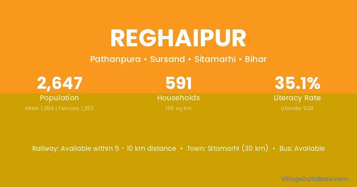 Sitamarhi (30 km) is the nearest town to Reghaipur village for major economic activities and is located approximately 30 km away.
