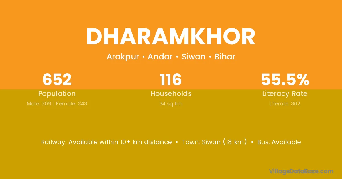Siwan (18 km) is the nearest town to Dharamkhor village for major economic activities and is located approximately 18 km away.