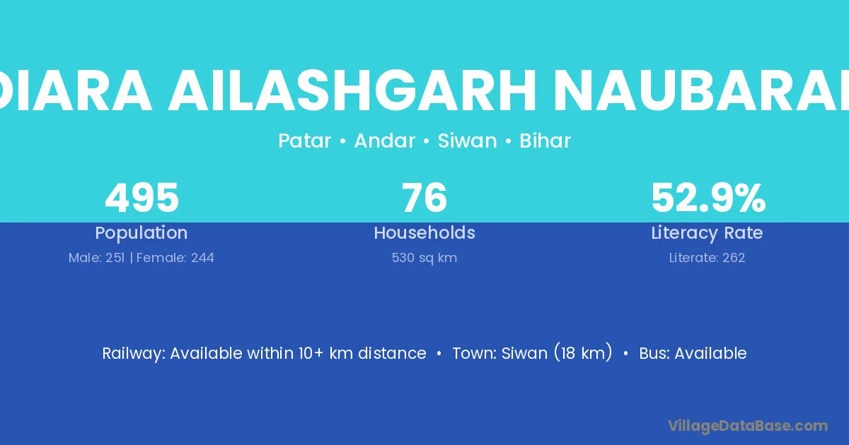 Siwan (18 km) is the nearest town to Diara Ailashgarh Naubarar village for major economic activities and is located approximately 18 km away.