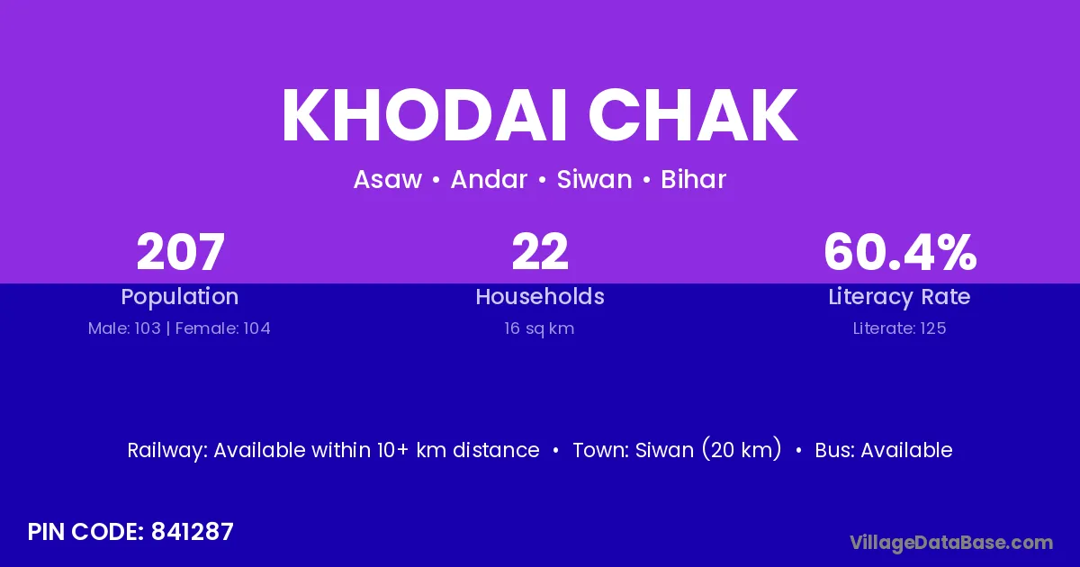 Siwan (20 km) is the nearest town to Khodai Chak village for major economic activities and is located approximately 20 km away.