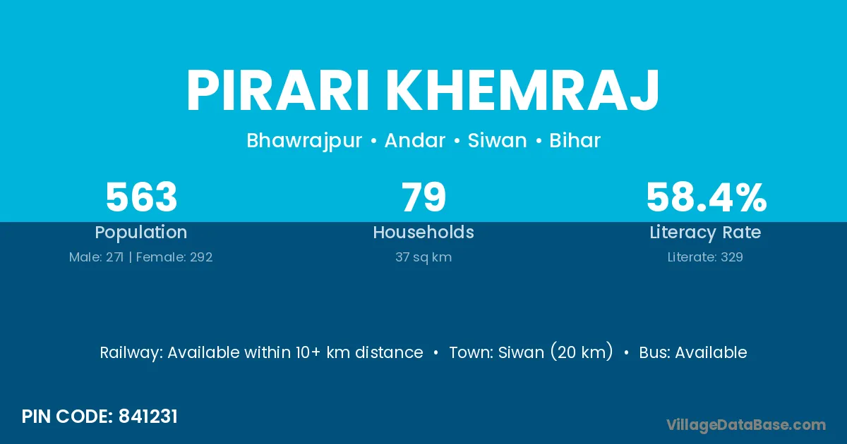 Siwan (20 km) is the nearest town to Pirari Khemraj village for major economic activities and is located approximately 20 km away.