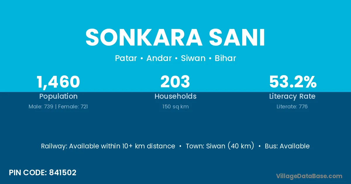 Siwan (40 km) is the nearest town to Sonkara Sani village for major economic activities and is located approximately 40 km away.
