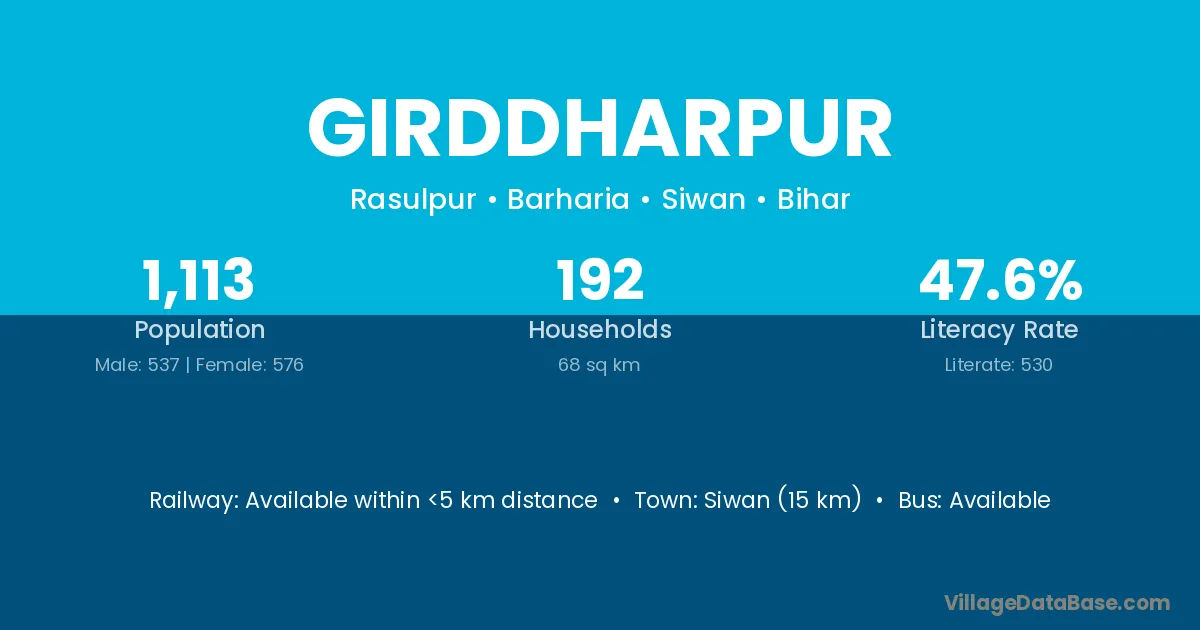 Siwan (15 km) is the nearest town to Girddharpur village for major economic activities and is located approximately 15 km away.