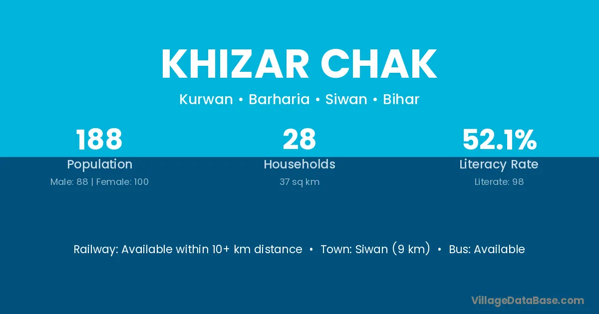 Siwan (9 km) is the nearest town to Khizar Chak village for major economic activities and is located approximately 9 km away.