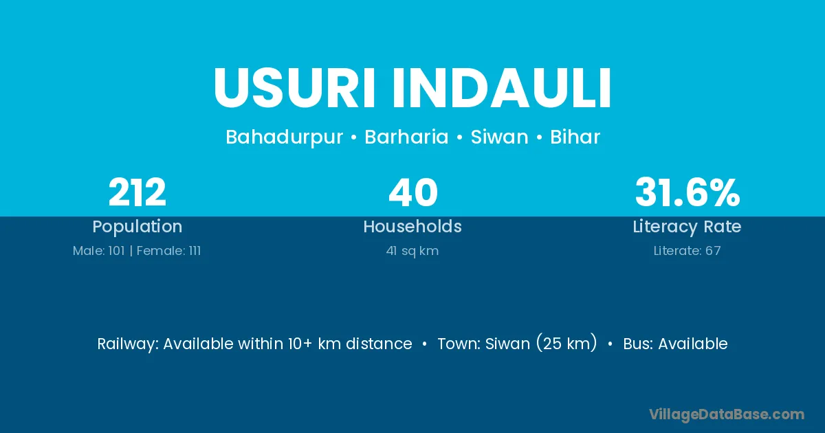 Siwan (25 km) is the nearest town to Usuri Indauli village for major economic activities and is located approximately 25 km away.