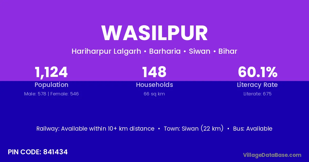 Siwan (22 km) is the nearest town to Wasilpur village for major economic activities and is located approximately 22 km away.