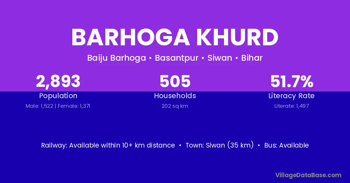 Siwan (35 km) is the nearest town to Barhoga Khurd village for major economic activities and is located approximately 35 km away.