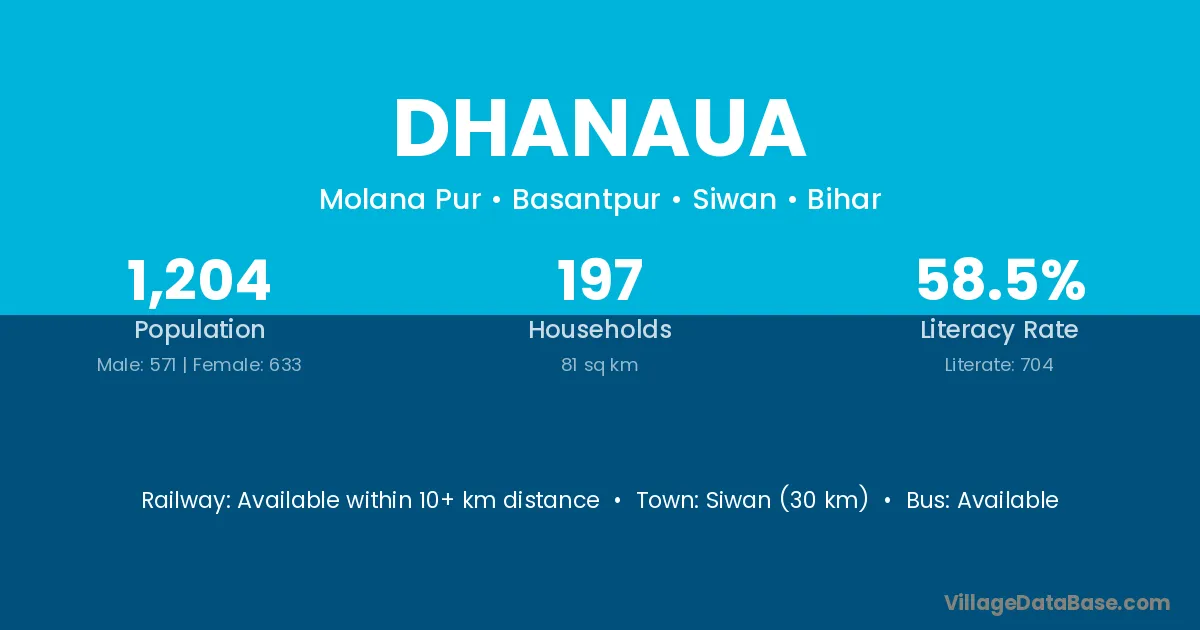 Siwan (30 km) is the nearest town to Dhanaua village for major economic activities and is located approximately 30 km away.