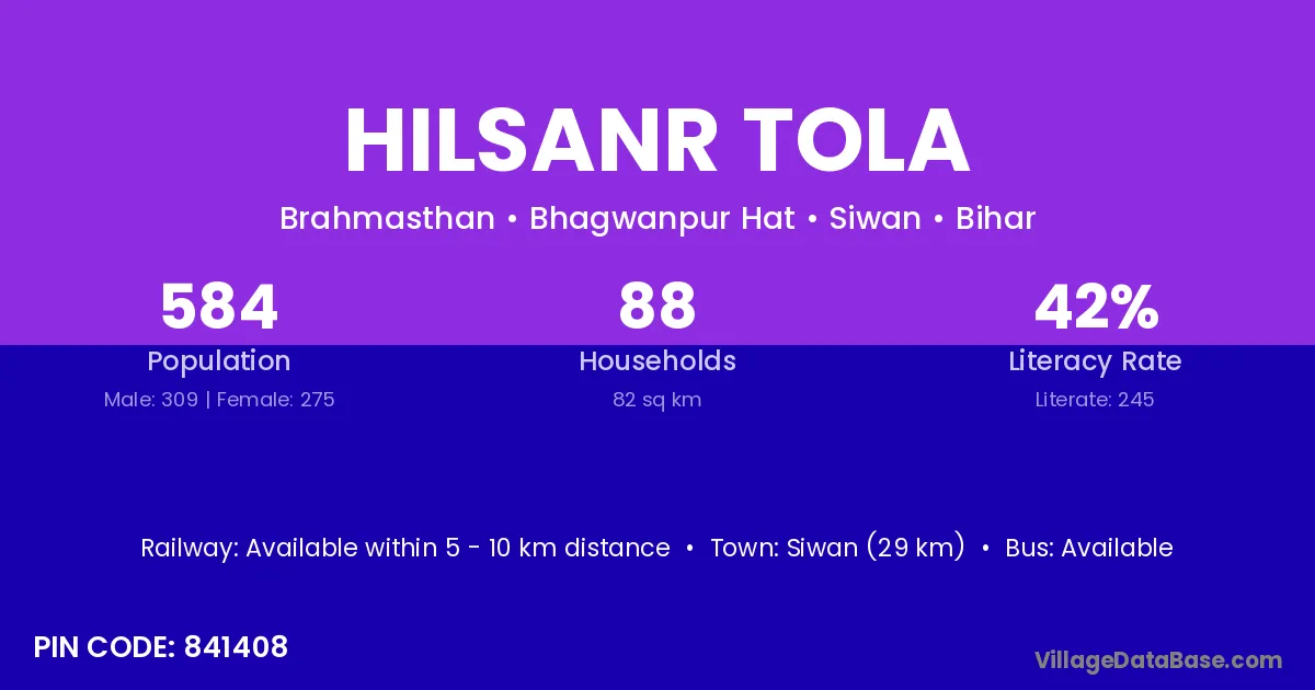 Siwan (29 km) is the nearest town to Hilsanr Tola village for major economic activities and is located approximately 29 km away.