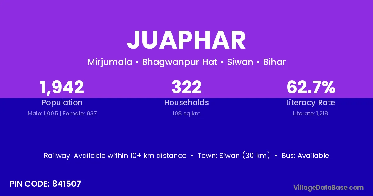 Siwan (30 km) is the nearest town to Juaphar village for major economic activities and is located approximately 30 km away.